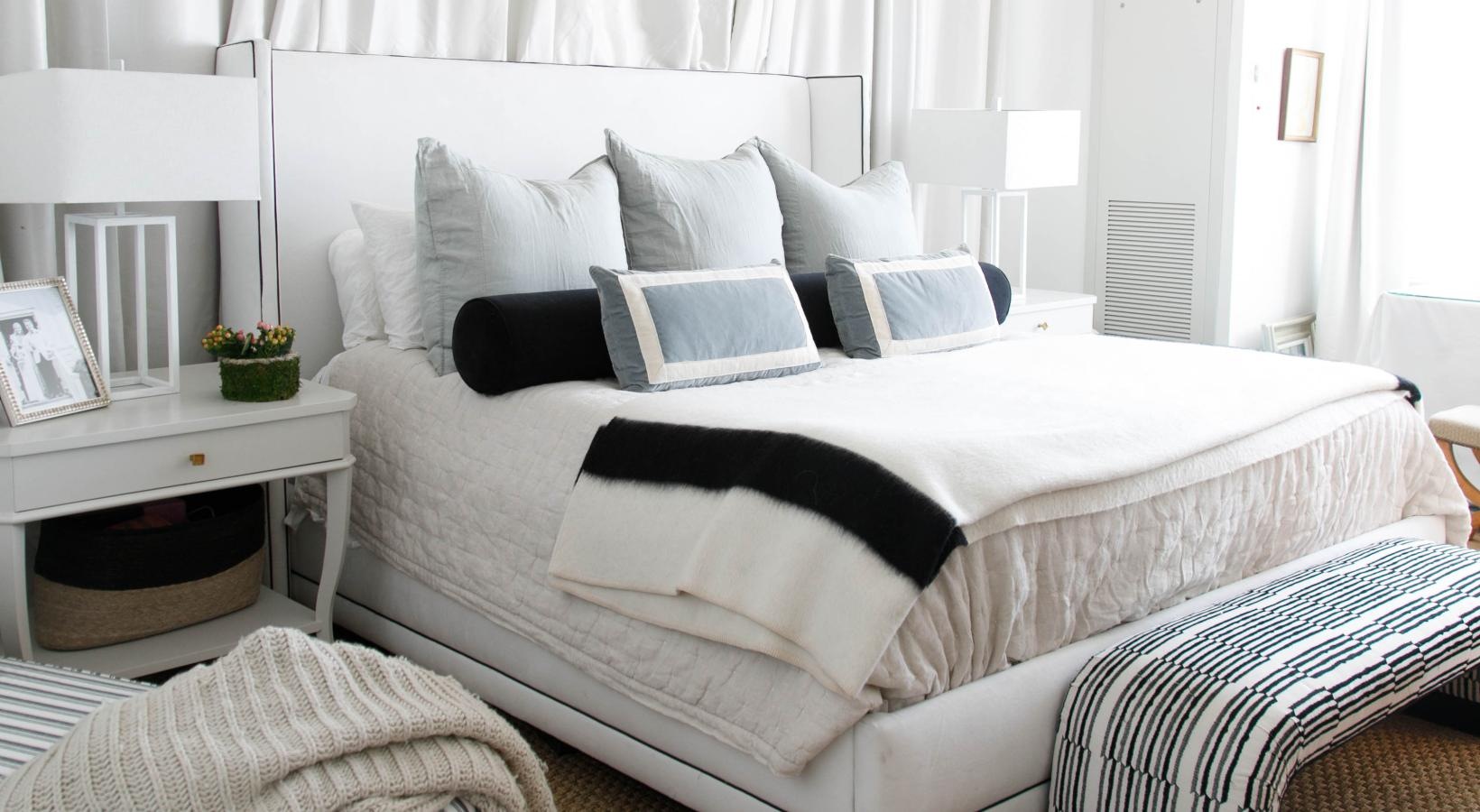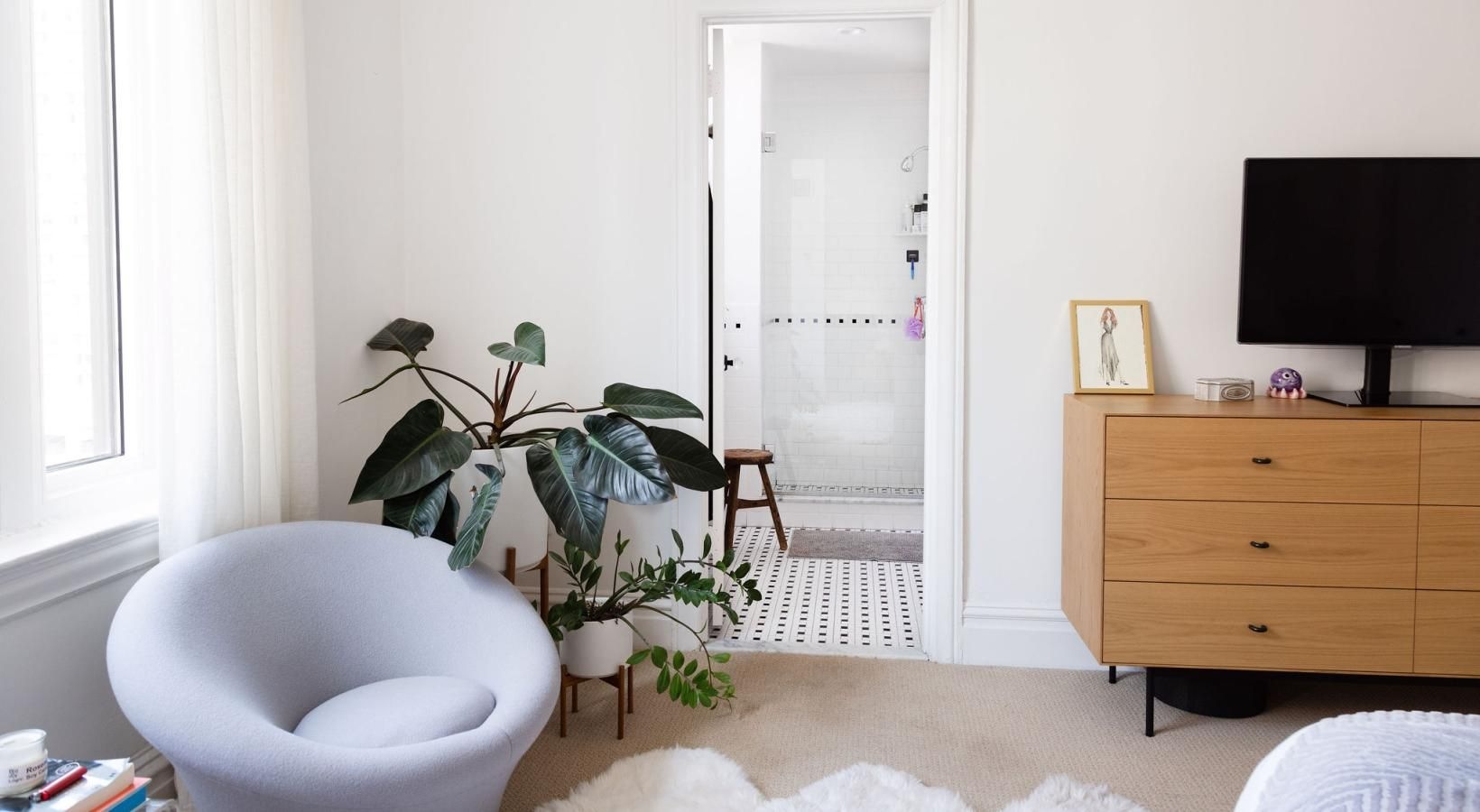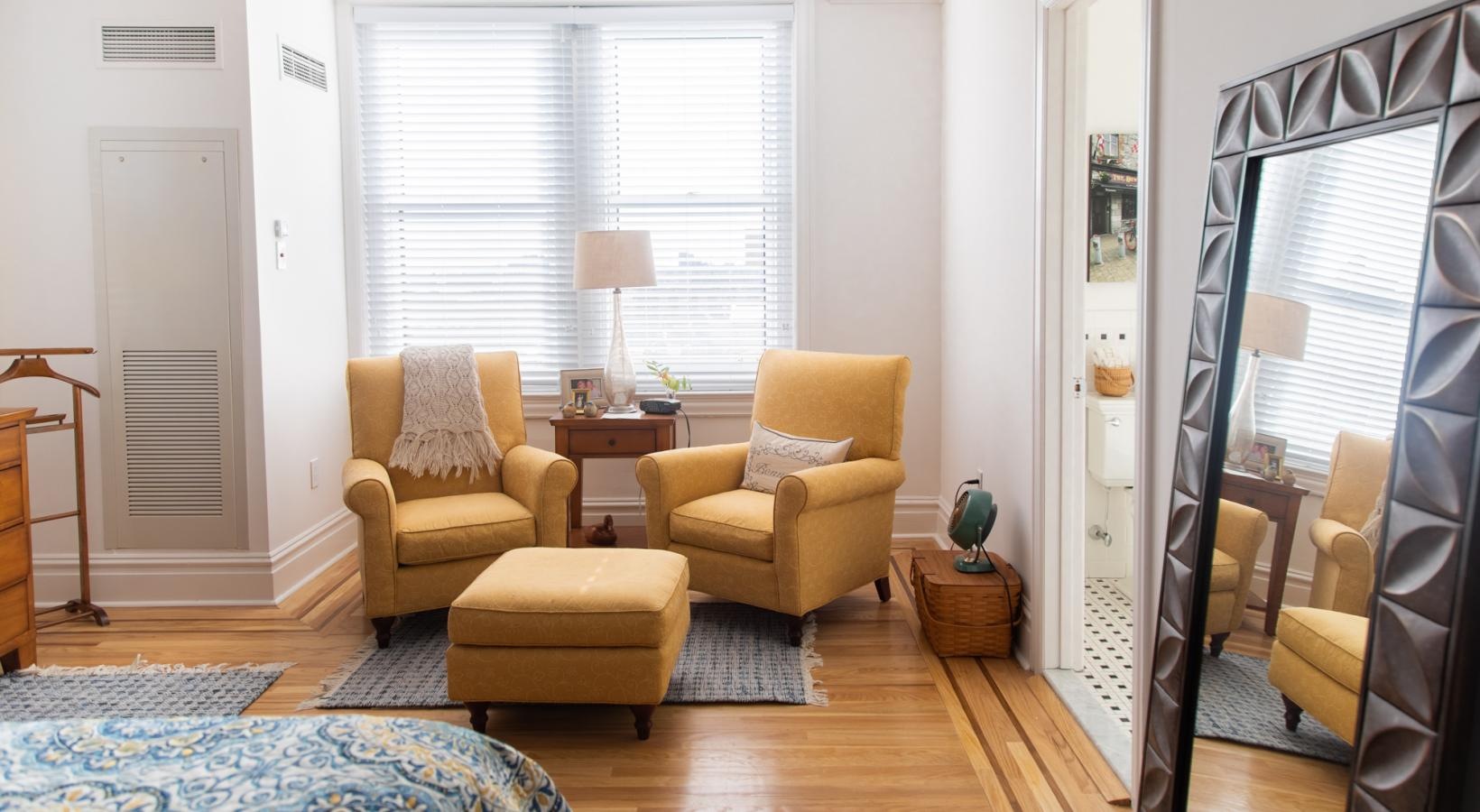 • comfy chair next to bright window and bathroom entrance in large bedroom